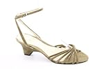 Costume suede high heel sandals. Ankle strap. Silver-tone buckle. Decorative straps. Gathered style. Open toe design. Covered wedge heel. Cushioned insole. Manmade sole.